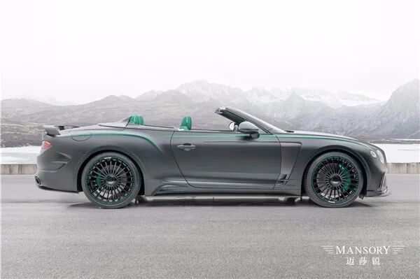 MANSORY refinement for the new Bentley Continental GT Convertible V8 with a complete vehicle conversion.Special finish matt black with colour accents in “chrome oxite green” and full leather interior in “chrome oxite green” with a new 3D leather elements, fully forged light weight wheels in 10x22 and 12x22inch, 640 hp (471 KW), 890 Nm, Vmax 330 km/h and 0-100 km/h in 3.8s, CO2 emissions 278 g/km (combined), 12,8 l/100km (combined).