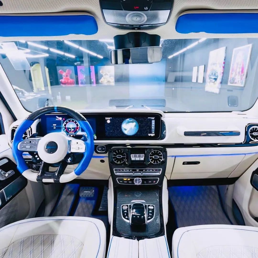 内饰无疑是MANSORY诠释匠心工艺的完美“媒介”:进入MANSORY G63 south sea blue座舱,方能了解“奢华”的真谛:座椅采用Mastrotto小牛皮打造,纯白的椅面缝有铬蓝色装饰线以及“MANSORY”官方标识,观感清新明快,素雅中尊荣具显;中控面板、地毯、扶手箱等部位均以缝制;内壁、顶棚选用Alcantara环保麂皮绒包覆;融入碳纤维元素的方向盘、控制台个性十足,极大提升了内舱精奢氛围和赛车级运动属性。